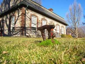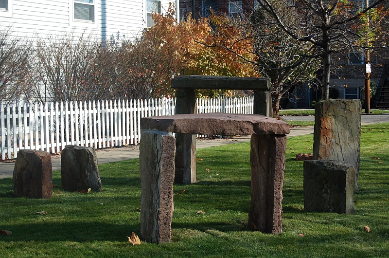 Oh, yes, as long as we’re looking at photos of our Moravian Church-founded town, allow us to give you a tour. In the top picture from left to right we see a former church, then we don’t see, just behind some trees, a large manor house originally built in the 1750s for the famous or, to some, infamous Count Zinzendorf. The next visible building, the light-colored one, is called the Sisters’ House, where the unmarried women of that community lived, and then over on the right is the current Nazareth Moravian Church. In the distance between there, sighting through the trilithon, is the circle at the center of town. You might say this town contains a s**t-load of history! Or you might not.