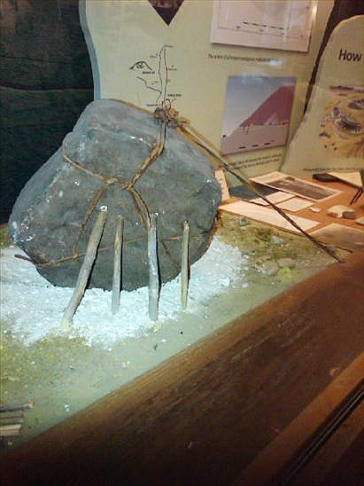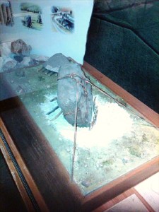 It is fascinating to see that, while the supporting poles do seem to have been moved, and the little antler replicas have disappeared, it looks as if the twine or string remains exactly as it was fifty-five years ago! You may well say, Why not?, but it seems to us somehow remarkable and wonderful, this sturdy stone somehow chosen to be a teacher while its fellows stay out on the landscape ignored, and this twine, probably wrapped in a moment or two by a museum worker, still just as it was.