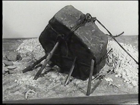 Apparently posting about Stonehenge replicas is, well, just not obscure and geeky enough for us. Otherwise why would we be so delighted to bring you this odd trifle–a film from 1955, narrated by well-known British writer and television personality John Betjeman, that includes, for a few seconds, the above model showing how the  stones of the Avebury monument may have been erected? [for those who don’t know about Avebury, see here.]