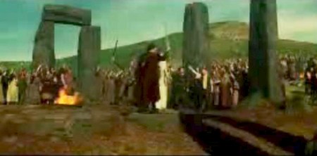 A quick posting of a few more movies with Stonehenge connections, starting with the rather amusing one in the 2004 movie King Arthur with Clive Owen and, the reason a lot of people went to see it, Keira Knightley as a rather scantily clad warrior maid. At the end of the movie they get married at a construction that a lot of people think is Stonehenge, although it is by the sea near Tintagel in Cornwall, some way from the real Stonehenge in Wiltshire. It is a nonexistent Stonehenge-ish thing made for the movie. Some video-ish shots of it can be seen here.