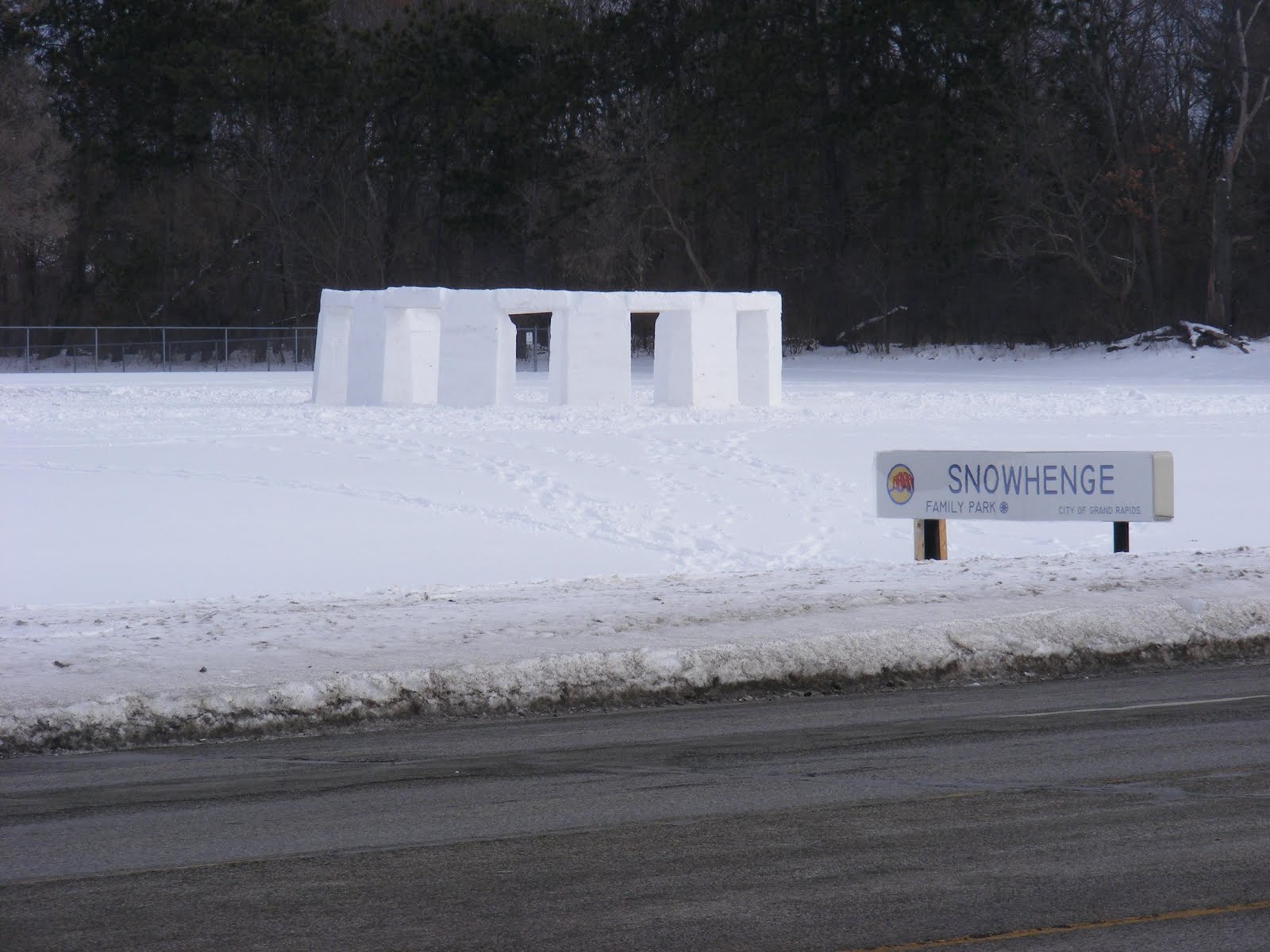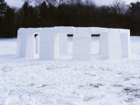 The ancient DRUIDS did it with stone, the Michigan DRUIDS do it with snow.” So says the Snowhenge blog from which this picture came. We distinguish it from the blog of friend-of-Clonehenge David Mantripp at snowhenge dot net, who took the photo that marked our first posted snowhenge.