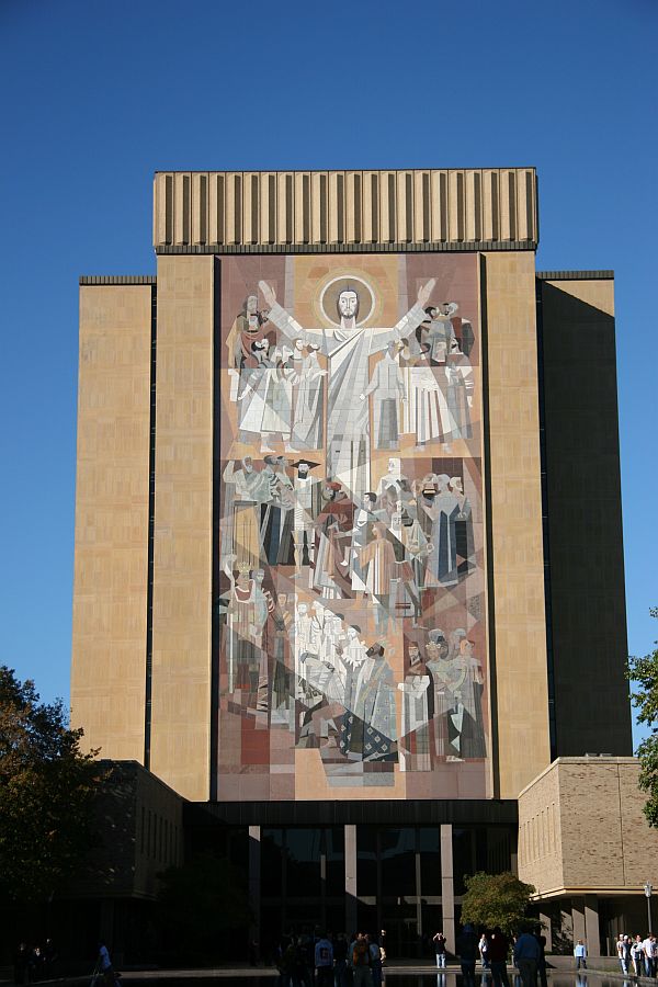 The proportions of the trilithons echo the architecture of the Theodore M. Hesburgh Library which stands behind it, as you can see in the same picture. As an interesting aside, another side of the library , seen on the left, displays a huge mural that depicts Jesus, the central figure in Christianity, teaching. Around Notre Dame, a school known for its American football team, this mural is affectionately known as Touchdown Jesus because his arms are in the position used by referees to signal a successful goal, or “touchdown” in American football.