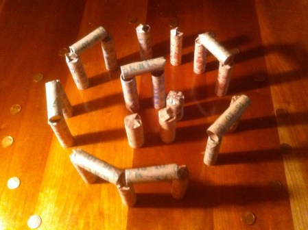 Just sent in yesterday by friend of the blog John Shaw-Rimmington, the thinking stone man, dry stone walling genius, and blogger at Thinking With My Hands. You see, in the US and Canada banks hand out these variously-sized paper tubes to people who have large amounts of loose coin. The coin owner then fills the tubes with the correct sized coins. A roll of nickels, for example, is $2.00. A roll of pennies is 50 cents, and so on.