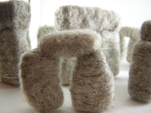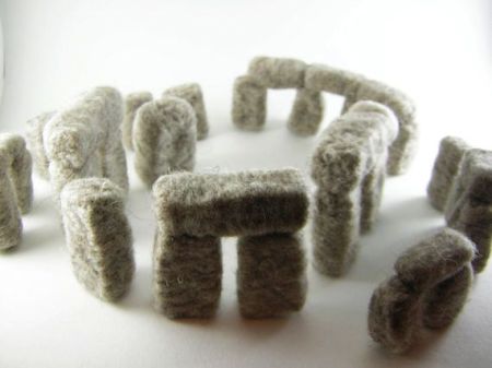 The Etsy page says, “…what you see here is a model of Stonehenge depicted in wool, I used photographs from a book and my own pictures to try and depict many of the rocks’ crevices. The real Stonehenge is 24 feet (7.3 m) tall and made of stone but the tallest of these stones is 2.5 inches (3.5 cm) tall and made of wool, so it’s lightweight and portable.