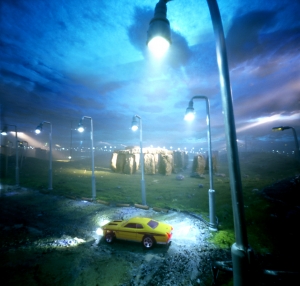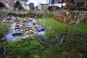 We’re thinking of going into technical writing. Ms. de Forest (no relation to Bones from Star Trek) tells us of this particular model, “The model is made in a mirror-box of about 150x150m in contour. Materials I used for my Stonehenge are Styrofoam, flock-grass, sand mixed with wood glue, led-lights, model cars. cotton wool and color foils (for the sky).