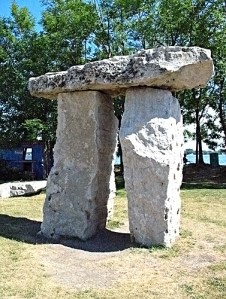 Before we go, we’re going to throw in another Stonehenge-related sculpture that has been lurking on our backlog list for a long time: Toronto’s Gateway to Understanding. The text on a Flickr page showing a picture of it reads, “The Gateway to Understanding, Harbourfront, Toronto, ON. To commemorate the Earth Spirit Festival held in July 1991. Through dialogue and cultural exchange, tolerance and understanding awaken within us. This structure will stand tall and bold as a symbol of the earth spirit. By David Ruben Piqtoukun.” He is an Inuit artist and we get the sense he is using the trilithon form for its portal/gate qualities more than as a Stonehenge replica, but we thought it deserved a mention. And we like the idea of the rough stone trilithon as a symbol of the earth spirit. That may be what that grey original huddled on Salisbury Plain was all about, (even if it was longing for some water to be pumped through it!).