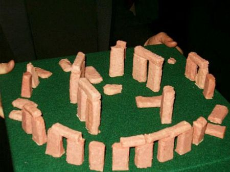 What makes this good? The green icing, grey stones, correct or nearly correct proportions, even stone shaping and texturing. What else, class? Yes, that is right–the inner trilithon horseshoe faces the three lintel stretch in what remains of the outside circle. The only thing that would tempt us to subtract druids is that we were not offered a taste. Still, this is magnificent. Even the blue stones are included. The artist really looked at Stonehenge and tried to make this a true replica. We are impressed.