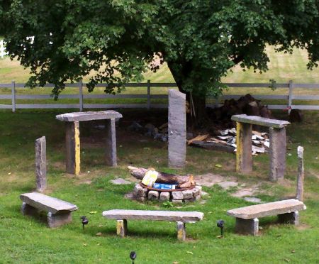 But on to the matter at hand. This belongs to the category of personal garden henges, like the  paved structure in Red Oak, TexasTremont Henge in Cleveland, or  the circle in Kennewick, Washington. Typically these are not large and sport only one or two trilithons. They often include benches in the form of very low trilithons. This one, like the Tremont, adds standing stones, representing, we suppose, the blue stones and maybe a stray sarsen. Its unique touch is the fire pit, which we are inclined to think is a touch the original Builders at Stonehenge would have recognised.