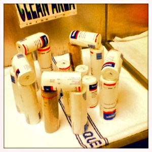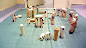 Back on January 27, we received the photo on the left with this explanation: “G’day [Clonehenge], After a particularly stressful day in the Burns Unit I was restocking bandages when the different sizes reminded me of the uprights with the lintels. Next thing I knew I had a Henge on my hands!” Of course she was being metaphorical (mediphorical?). It wasn’t on her hands, but was, as we can see, in the Clean Area.