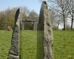 While it is a trilithon and resembles Stonehenge in its sun connection, this sculpture also echoes the Bolivian ruin also called the Gate of the Sun. Mr. van Beek may have had both ancient monuments in mind. A scan of his webpage will show that he has a fascination with standing stones and variations on the trilithon form. Our kind of guy! (Except he works hard and has talent.)