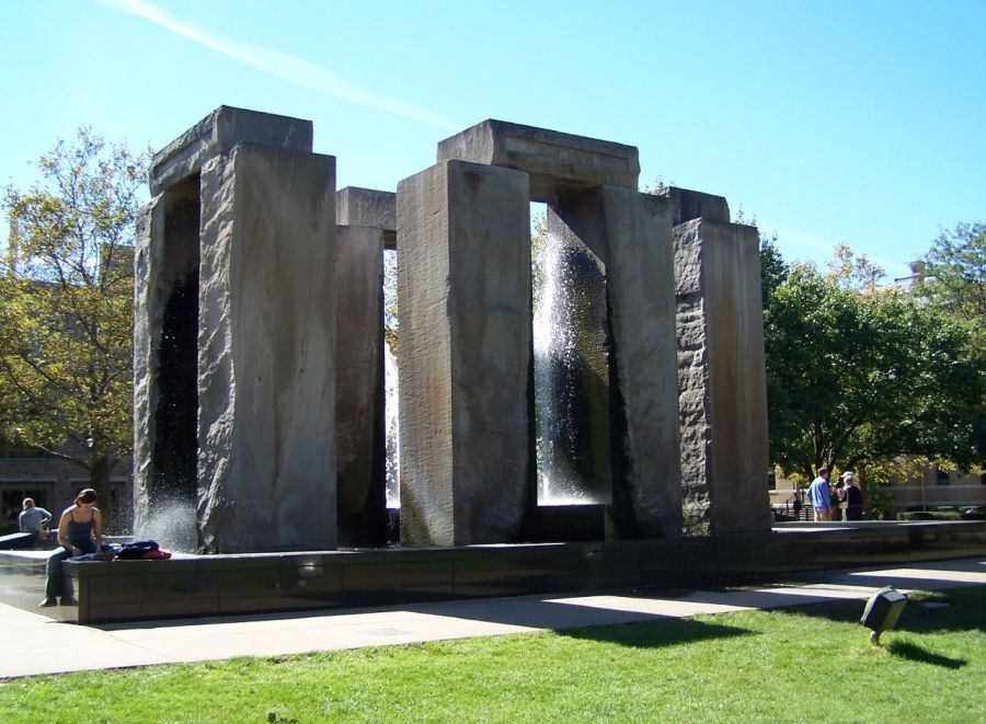 On this page we find this paragraph about the fountain, “A survey published in a recent edition of The Dome revealed that 68 percent of Notre Dame’s senior class had run through the waters of Clarke Memorial Fountain at least one time. Certainly an even larger percentage has gravitated here to study, socialize, and even dance in the shadow of this campus landmark. Perhaps the lure of the fountain lies in the hauntingly timeless appeal of its mammoth form, which noted New York architects Philip Johnson and John Burgee (Notre Dame class of 1956) purposely designed to mimic the mystical, monolithic monuments built in Britain during the Bronze Age. Not surprisingly, its nickname is Stonehenge.”