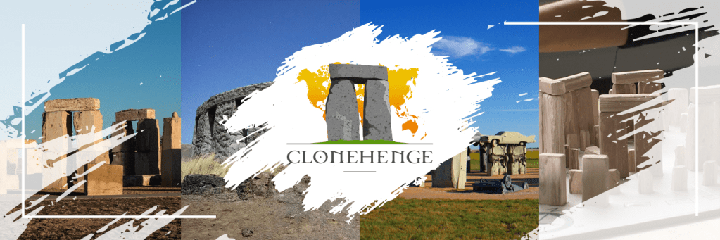 In gearing up for the Clonehenge World Map which is due to be finished by September or October, we commissioned a new logo and a new banner image to use on our social media accounts. In the banner above you can see, left to right, the Odessa, Texas Stonehenge, the Maryhill Washington State Stonehenge, Carhenge in Nebraska, and a small wooden Stonehenge. We think Lena Bane, the artist, did a wonderful job.